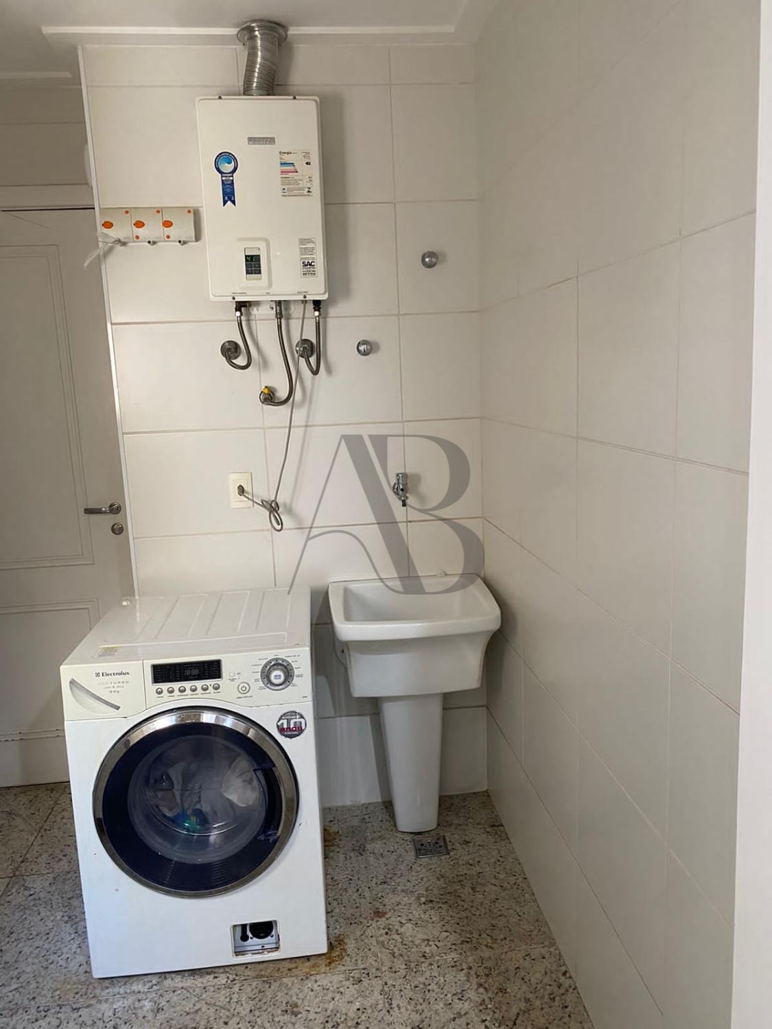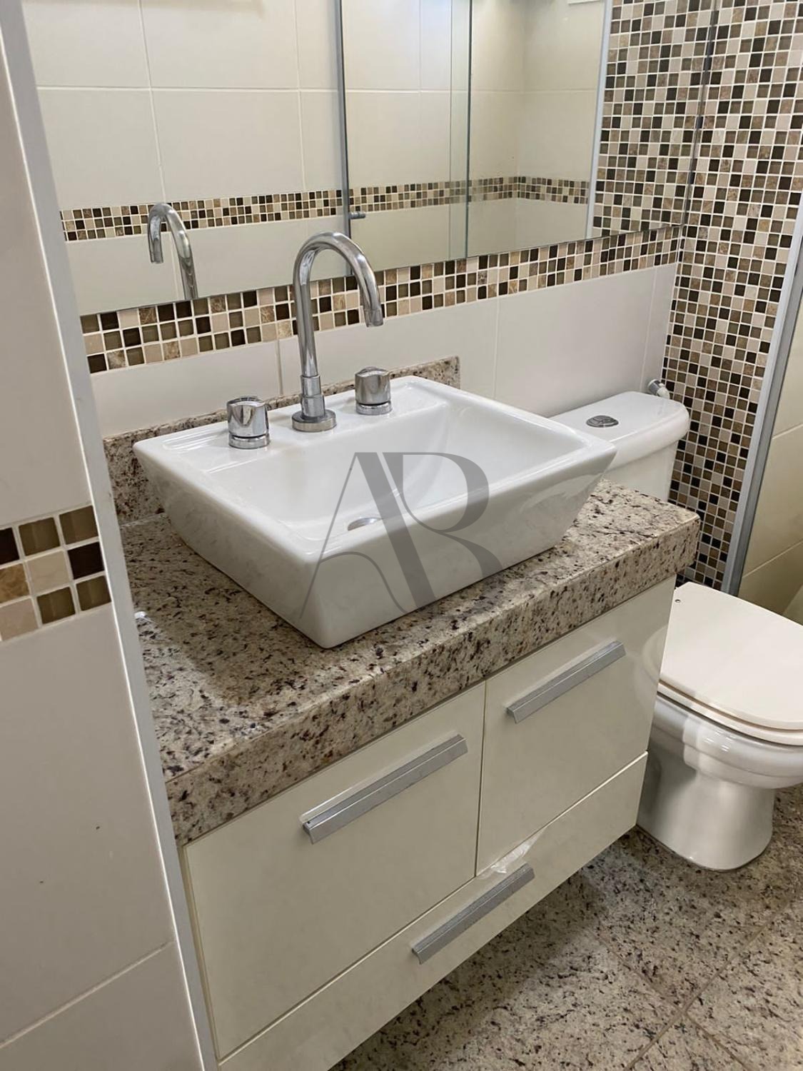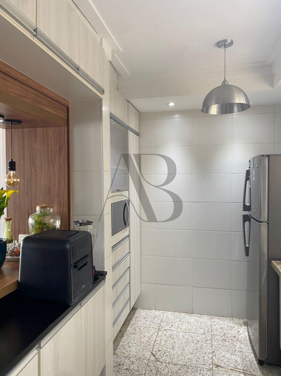 Cozinha e banheiros com bancadas de granito e piso em excelente estado de conservação.